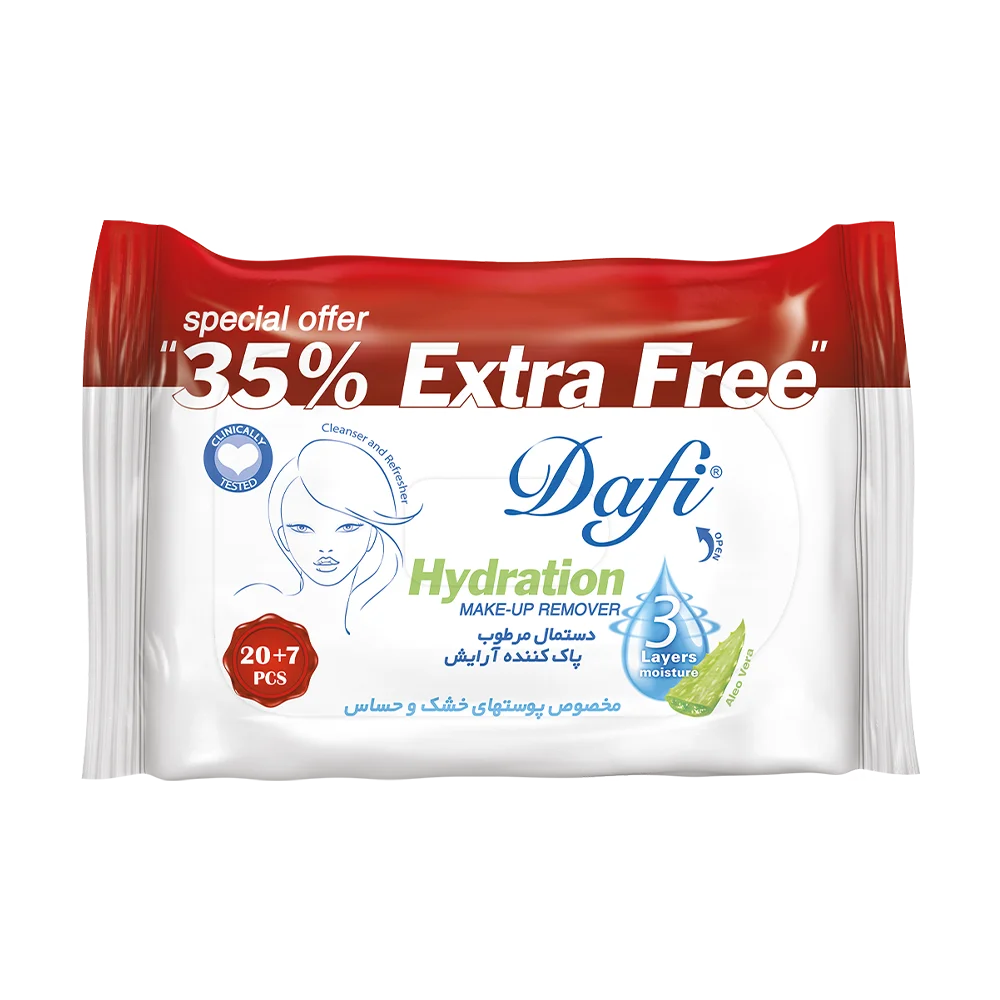 خانم ها برای داشتن پوست سالم و درخشان همیشه باید رسیدگی های لازم پوست را رعایت کنند تا به مشکلات جبران ناپذیری همچون، جوش، آکنه، لک، حساسیت های پوستی و جوشهای سرسیاه دجار نشوند. ماندگاری آرایش در ساعات طولانی موجب عوارض گوناگون میشود که توصیه شده است بعد از حداکثر 4 الی 5 ساعت پاک شود. سادهترین کار بعد از یک روز باقی ماندن آرایش و آلودگی طولانی مدت روی صورت، استفاده از یک دستمال مرطوب با کیفیت است. دستمال مرطوب پاککننده آرایش دافی مدل اکسترا در بستهبندی 27 عددی با دارا بودن عصاره لیمو و خیار موجب شادابی و حفظ لطافت پوست صورت میشود. از خواص این دستمال میتوان به ضد التهاب و ضد حساسیت یودن آن اشاره کرد که از ایجاد جوش و قرمزی جلوگیری کرده و همچون یک محافظ پوست عمل میکند. این دستمال حاوی عصاره خیار و آلوئهورا است که به دلیل دارا بودن خاصیت آبرسانی، موجب افزایش رطوبت پوست و نرم کنندگی آن میشود.